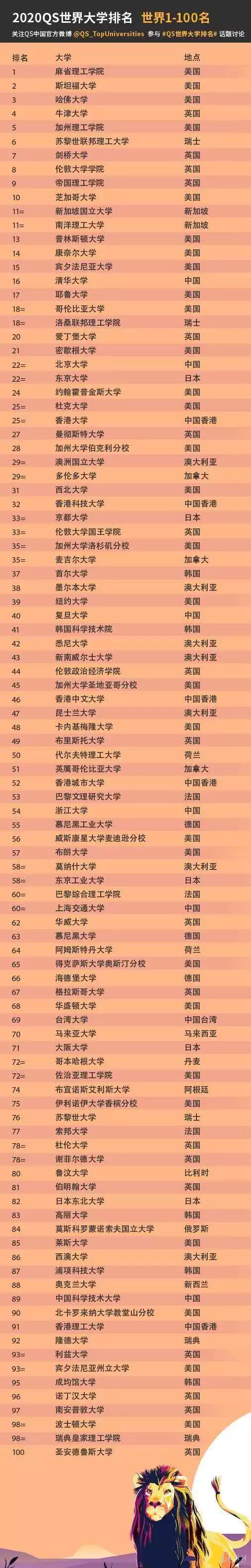 美国依旧垄断TOP3! 麻省理工大学(MIT) 连续八年垄断榜首, 斯坦福 大学 和 哈佛大学 紧随其后。今年共有29所学校跻身前100,是自2016年以来最少的一次,但仍是入选学校数最多的国家,综合实力傲视全球。