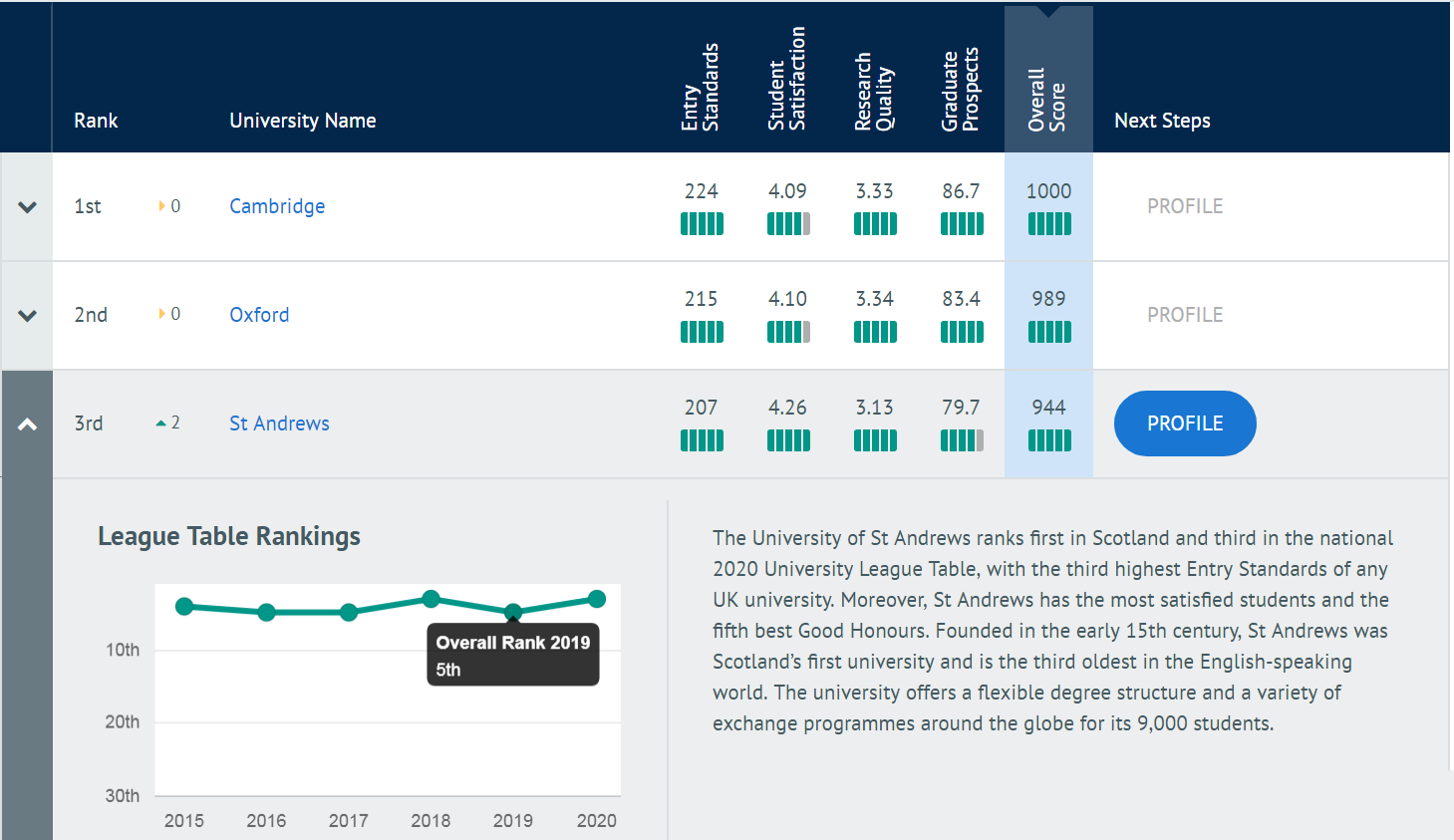 在《完全大学指南》的官网上,显示的指标为:入学难度(Entry Stanars),学生满意度(Stuent Satisfaction),研究质量(Research Quality),就业率(Grauate Prospects)和总得分(Overall Score),还显示某所大学今年的排名跟之前相比的变化趋势。