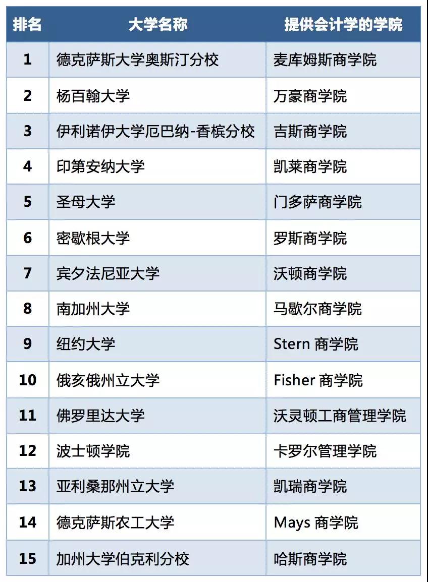 不过值得注意的是该排名得出的方法:评选方法是让美国受认证的商学院院长和高级教职员工进行投票。US News要求这些商学院院长和高级教职员工各自提供一个清单,列出自己认为的10个最佳会计学项目,然后再统计各个学校被提名的次数,从而得出上述排名。所以说与其说是教学实力的排名,不如说这是一份项目的声誉榜单。