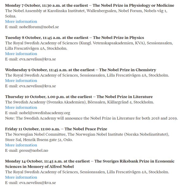 言归正传,2019年度诺贝尔奖的颁布时间为10月7日到10月14日,今天最后一个奖项花落谁家已见分晓,现在我们来梳理一下。