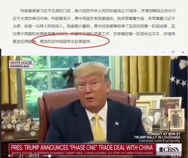 特朗普说:“最近有一些虚假传闻说我们的学校要拒绝中国学生来就读,这绝对是虚假的,毫无根据的!”