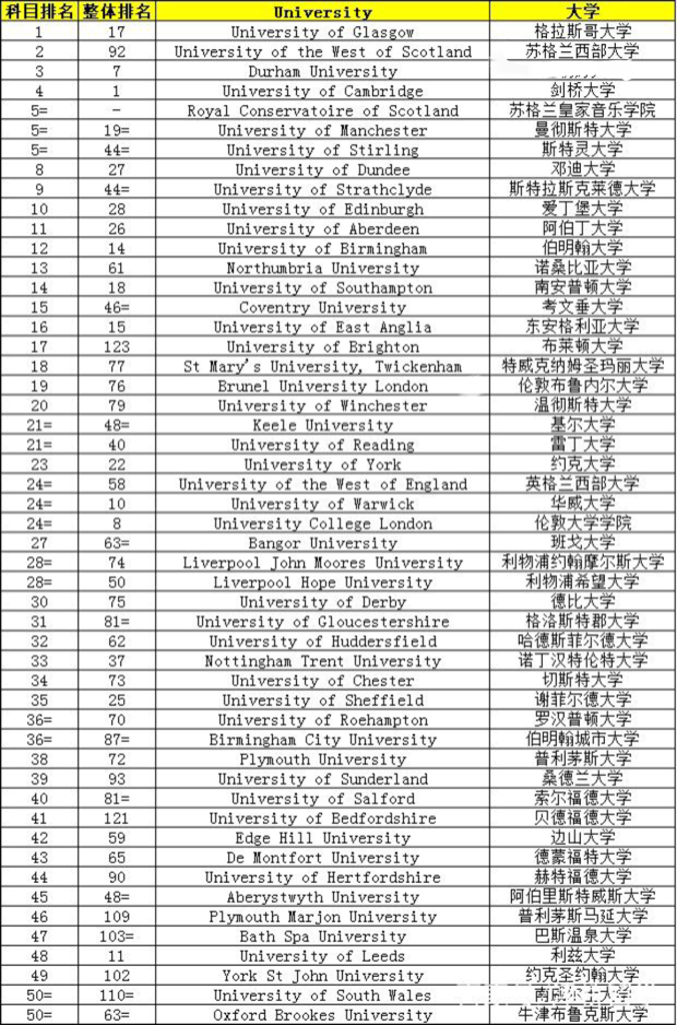 以下是 2019TIMES 英国大学教育学专业排名 TOP50 院校榜单,供大家选校参考