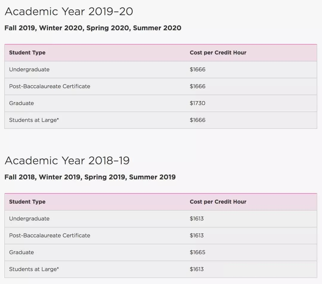 本科学生要求128分毕业,2019年秋季,学费就会涨到1666刀一分,也就是213,248刀。学费每年都会略有增长,15年的时候,一学分还是1400多刀,可见涨的也不少,就算21.5万刀吧(也就是拿下本科学位的学费总数大概为146万人民币)。把学费平分下来,也就是每年36.5万人民币。