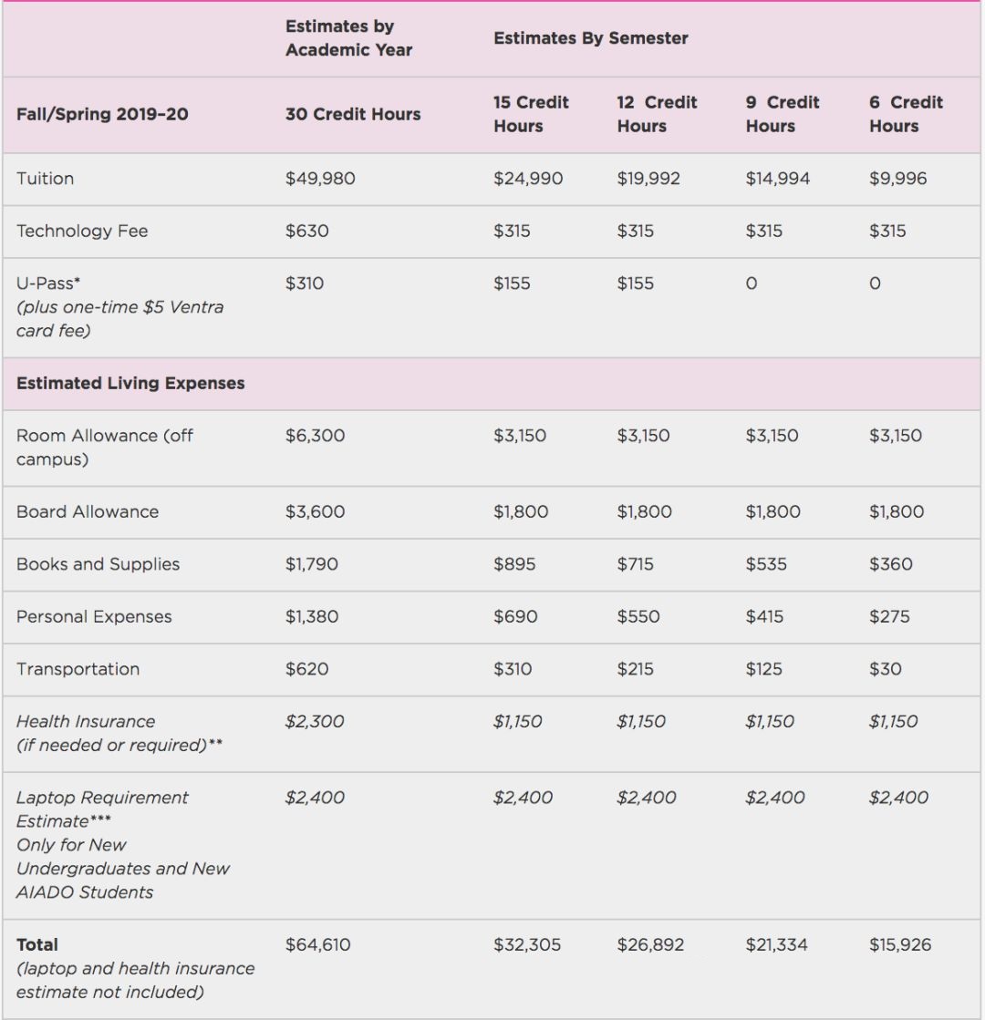 芝加哥艺术学院的官网也非常贴心的帮助学生估算了上学所需的预算,以下表格数目为美金
