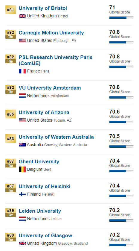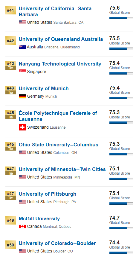 哈佛大学依然居冠军宝座,前四位排名和去年无变化,分别是: 哈佛、MIT、斯坦福大学和加州大学伯克利分校; 前十名的学校中,8所来自美国,2所来自英国。