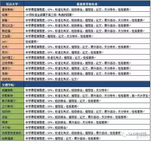 下面的表格中列举了USNews排名前10 + 常青藤其余3所 + 最牛公校加州伯克利,以及文理学院前10大学的最重要录取标准: