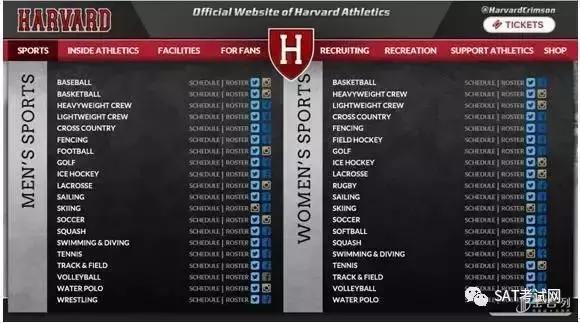 其次,学校的新生录取人数越少,运动队伍越多,机会越大。仍然以斯坦福和哈佛为例,两所学校每年发放录取书都是2000出头,接受并入读的学生均为1600多。下面两幅图是两所大学竞技队伍列表: