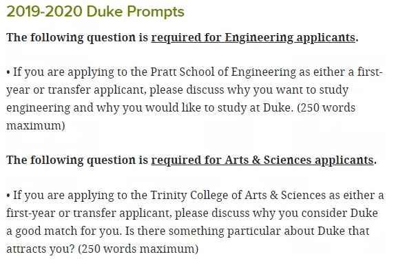 从上面我们可以看到,它对申请不同专业的学生,都要求写一些和这些专业相关的小文书。这也再一次证明了杜克其实非常看重高中生对自己未来专业方向的想法和认识。