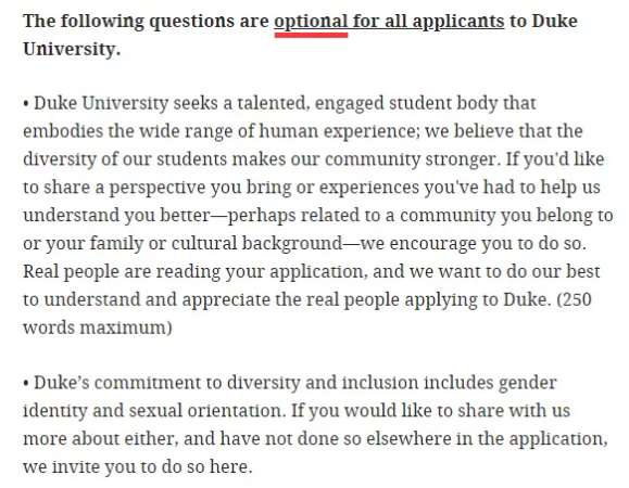 文书: 除了主文书之外,杜克要求 两篇小文书, 一篇必选(根据自己选择的学院),一篇optional(可选)。