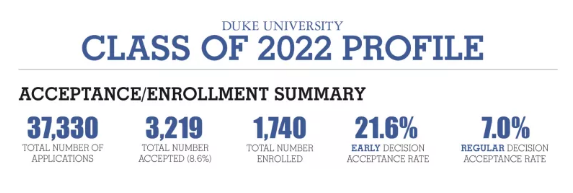 从数据上来看,2015-2016学年,ED阶段的录取率在24%,而RD录取率只有9%。加上前面我们也有提到,2018年秋季ED录取率是21.6%,RD录取率只有7%。所以如果你打算申请杜克大学。早规划早申请的优势是非常非常明显的。