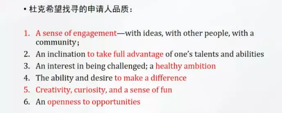 除了以上的六个因素之外,杜克还希望在申请人身上看到一些不一样的、或者说比较明显的品质。