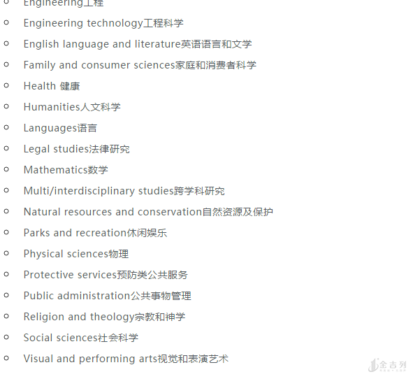 这些专业下面还有细分专业,比如商科的细分专业可能包括:Accounting 会计、Business Aministration & Management工商管理、Business Information Systems 商务信息系统、Entrepreneurship创业学、Finance 金融学、International Business 国际商务等等。