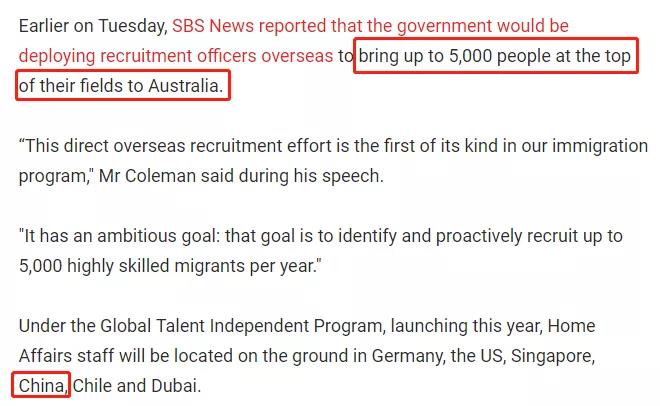 同时,移民部还宣布了一项重大决策:澳洲政府将在今年正式启动——全球人才独立计划(Global Talent Inepenent Program),每年在海外招揽5000名各领域顶尖人才来澳。移民局专员还会在中国、美国、新加坡、德国、智利、迪拜等国设立办事处,每年为澳洲吸纳人才。