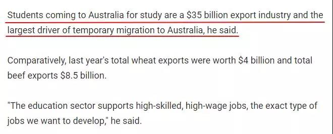 他说:“澳洲去年小麦的出口总额仅为40亿澳元,牛肉出口总额仅为85亿澳元,而澳大利亚国际教育产业已经是一个价值350亿澳元的出口行业,成为了临时移民来澳的最大推动力。”