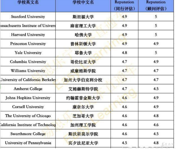 金吉列从这两个角度出发,给大家整理了美国教育界人士,也就是同行中评分的榜单,来看一下顶级名校的分数排名: