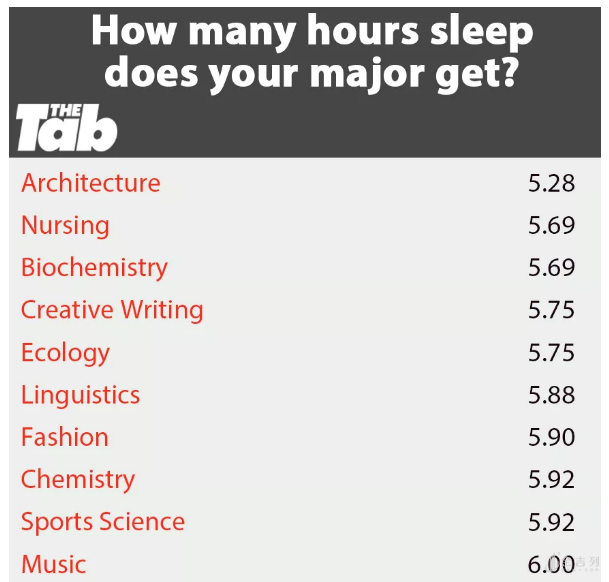 The Tab也做过调查,看看各个专业的学生每天都能睡多少小时:
