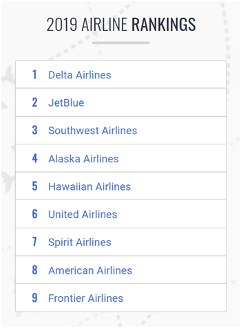 排名第二的捷蓝航空超越了三大航空之二的 AA 和 UA,说明还是实力在线的。