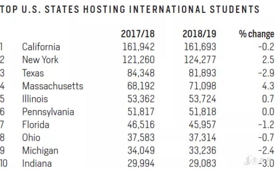 其中,吸引留学生最多的州是加州、纽约州、德克萨斯州。根据报告中的数据,在美国留学的国际生,大多数就读于纽约大学(连续六年国际学生人数排名第一),南加州大学稳居第二。前十名还有:东北大学、哥伦比亚大学、伊利诺伊大学香槟分校、亚利桑那州立大学、加州大学洛杉矶分校、普渡大学西拉法叶分校,加州大学圣地亚哥分校和波士顿大学。