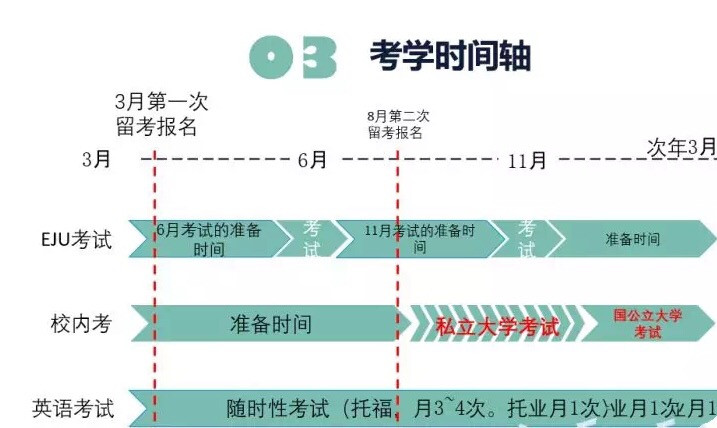留考之后是校内考,每一所大学的校内考时间都不同。 6月份留考结束以后,大多数是私立大学的出愿。11月份留考结束以后,大多数是国公立大学的出愿。 留考、校内考缺一不可,但同学不要忽略一个重点,那就是英语成绩。英语成绩是考取日本名牌大学的必备条件之一。老师在这里也规划了一个一整年的时间轴,希望同学们能知道什么时候该做什么事情,该备考什么! 看到这里同学们是不是对这一整年的学习规划有一定的概念了呢?