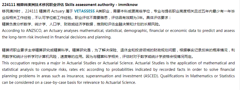从上图我们可以看到,精算移民不一定要读研究生,本科或者以上学历都可以的。但是需要满足的条件是精算本科,及一年以上行业相关工作经验。