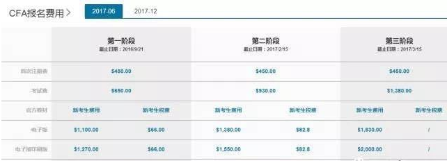 学费包含了CFA的注册费以及两次CFA的考试费,以及教材费。下面是2017年6月CFA的相关费用(美元),同学们可自行换算成你熟悉的币种感受这价格不菲的考试。