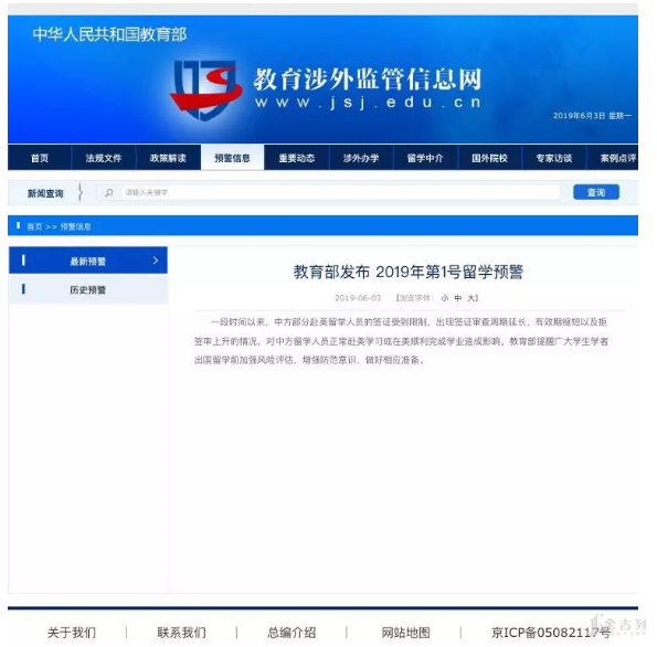 5月14日,美国部分国会议员提出一份法案,拟限制部分中国公民赴美学习或进行学术交流。 某著名美国大学也开除了华裔教授,关闭了其科研实验室。六月,教育部发布 2019年第1号留学预警提醒广大学生学者出国留学前加强风险评估,增强防范意识,做好相应准备。