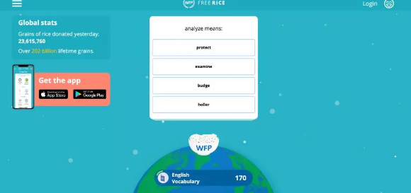 Free Rice是一个联合国世界粮食计划署办的网站,规则十分简单,通过选择英语单词的近义词答题,难度随着答对次数的增多逐渐增加。每答对一题,盘子上就会放10粒大米,而网站赞助商便会向联合国世界粮食计划署提供这10粒大米。