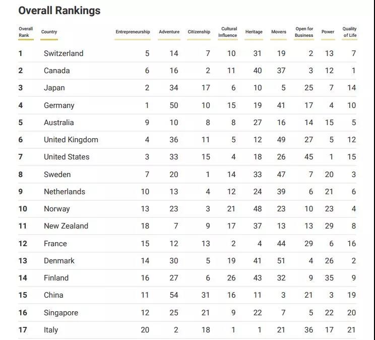 瑞士再次被认为是最佳国家。这个以中立著称的国家,在“贸易开放”领域得分是全球第二,在“企业精神”领域得分是全球第五名,在“生活质量”和“公民权利”领域得分排在全球第七名,而在“文化遗产”领域得分排名相对较低。