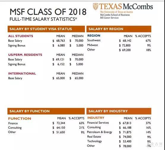 UTA 毕业的所有学生平均工资 $ 68,763 ,平均签约奖金 $ 6,080 ;中值工资水平是 $ 70,000 ,签约奖金中值是 $ 5,000 。其中国际生的平均工资和中值工资都是 $ 65,000 。 67% 学生的工作集中于西南部,平均薪资是 $ 68,142 ; 9% 的学生在中西部工作,另有 18% 的学生在其他区域工作。这些毕业学生的工作基本集中于金融和咨询行业,工作于金融行业的学生工资的平均值 $ 72,344 ,收入比较可观。金融行业的从业者除了基本工资之外,福利待遇也是十分诱人,前几年金融行业发展迅速的时候,有相关从业者透露年终奖有 50 月以上的工资,即使在这几年,金融发展比较平缓的时期, 10-20 月的年终奖也不少见。