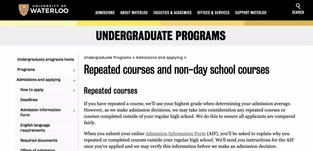滑铁卢大学大部分专业是接受重修的成绩,在录取的时候会取最高分数用于计算12年级平均成绩,但需要在提交申请表格的时候合理说明原因。
