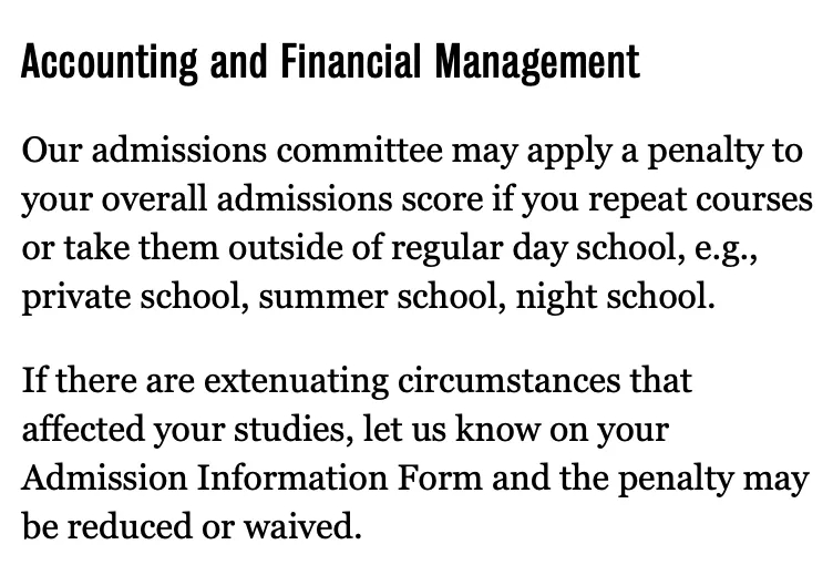 在使用重修课程或校外学分申请滑铁卢会计和金融管理时候,录取办公室可能会对你的总成绩做出一定的惩罚(具体如何惩罚没有说,但按照往年的经验应该可能是扣分、或者同等分数条件下优先录取没有重修课程的申请者)。但是如果能给出合理的解释,这个惩罚可能被免除。