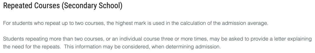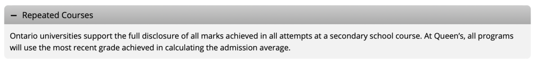 当一个学生有重修课程的时候,皇后大学在录取时会取最近的一次成绩用于计算12年级平均成绩。