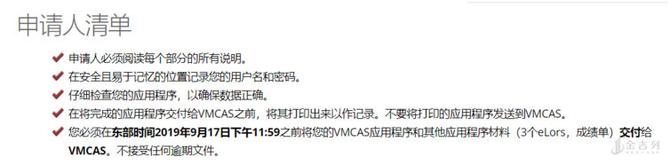 3.截止日期 september 17th, 9 月 17 日截止 you must eliver your vmcas application an other application materials ﹙3 elors, transcripts﹚ to vmcas no later than september 17th, 2019 @ 11:59pm, eastern time . no late ocuments are accepte.