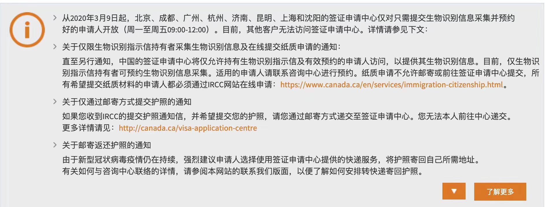 从2020年3月9日起,北京、成都、广州、杭州、济南、昆明、上海和沈阳签证中心将开馆,学生们可以提前预约录指纹,且签证中心只针对需要提交生物识别信息采集并预约的申请者开放!营业时间为:9:00-12:00,仅仅上午哦!务必提前预约且安排好时间!签证中心不接受纸质递签或者签证材料的邮寄,所以目前唯一可行的递签方式就是做网签,在加拿大移民局官网递交你的签证申请,第一次递签需要去以上8个签证中心完成生物信息的采集!如果是大使馆要求的补充护照,也只能通过邮寄的方式到签证中心哦!