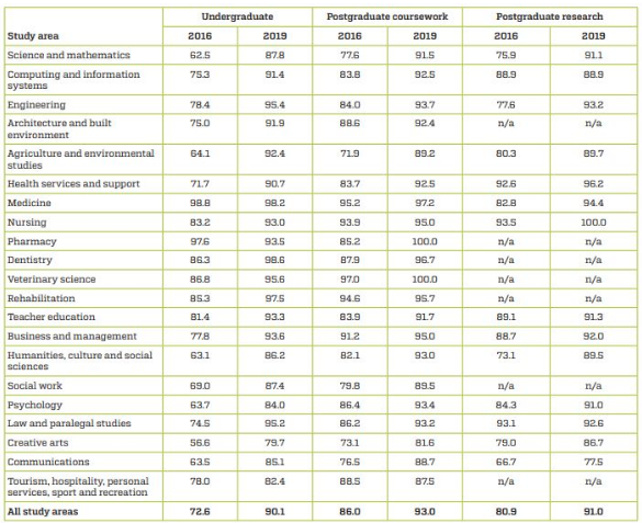 2019毕业生调查统计了澳洲75所院校,共42,466人,其中包括40所大学,以及35所非大学高等教育机构,数据显示现在澳洲毕业三年内找到全职工作的毕业生比例已达90.1%! ,薪资中位数更是达到$72,800。