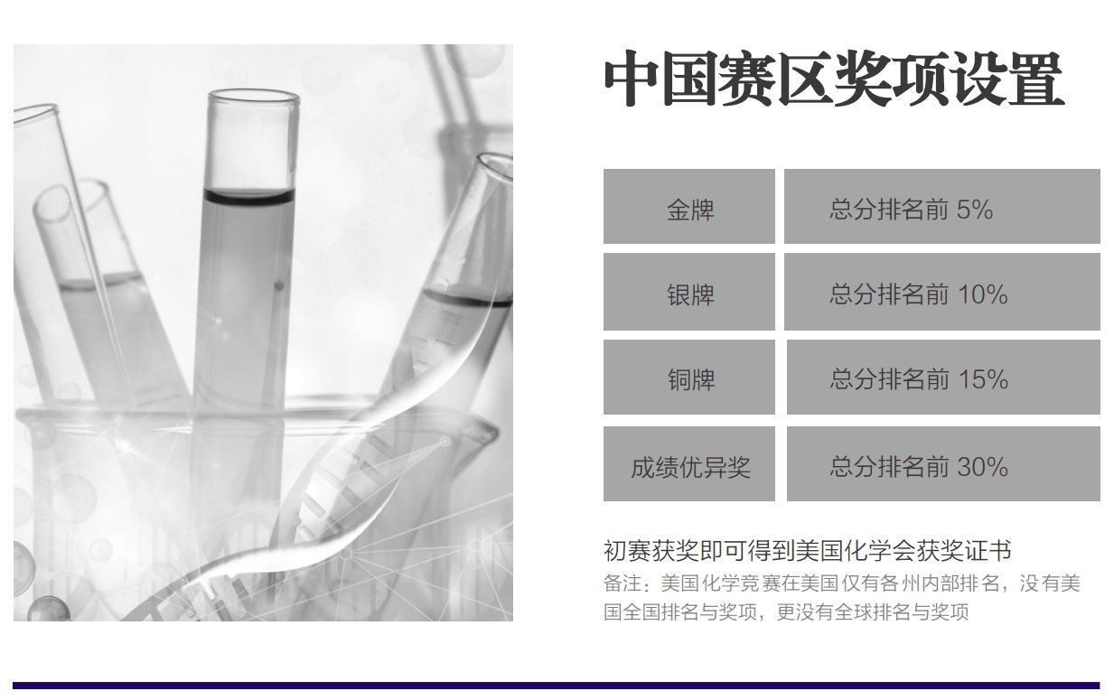 2018年起,美国化学学会授权英国素质教育发展认证中心ASDAN中国办公室举办美国国家化学竞赛中国区赛事,让更多的中国学生体验化学学术魅力和美国顶级的高中生化学学术活动。 虽然中国籍学生不能进入复赛参与美国国家队的选拔,但 是 成绩优秀者可以增加未来申请美国理工科专业的优势,更有机会获得国际顶级科学类活动的邀请。