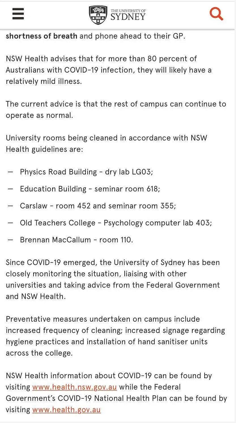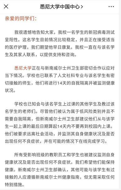日前,悉尼大学已经出现确诊案例,学校已经发送邮件通知,悉大官方微信也给予了回应。