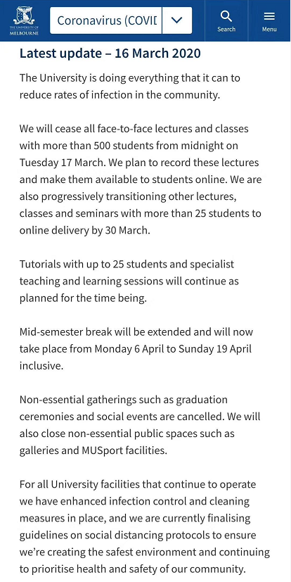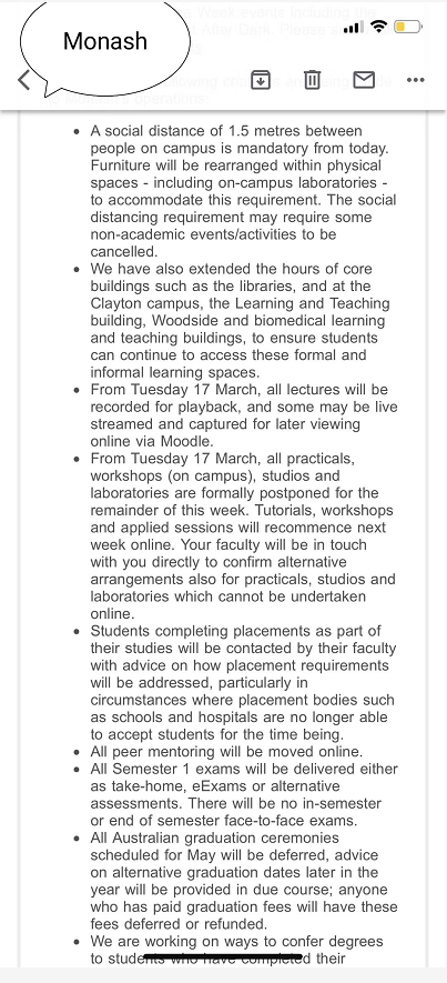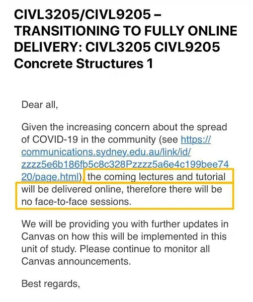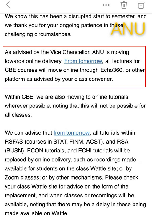 无论是线上还是线下,讲座课程(lecture)还是辅导课程(tutorial)全部暂停一周,这也是澳洲八大里第一个做出关校决定的大学!