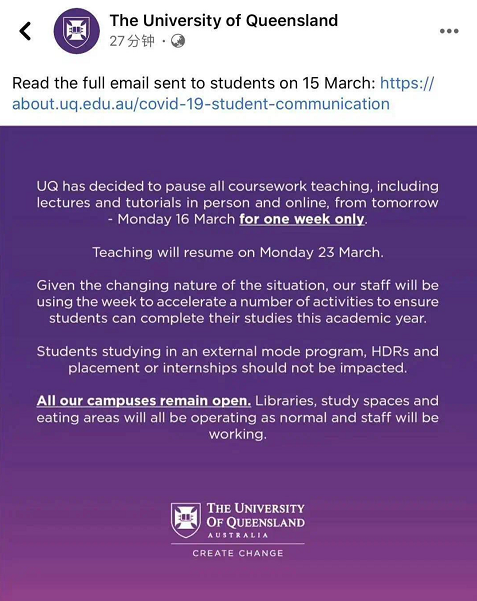 接连出现学生确诊病例的UQ坐不住了,就在昨天UQ宣布将从3月16日-3月23日关校一周!