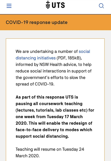学校方面表示:目前UTS并未出现确诊人员,但是附近的悉尼大学已出现一例确诊,停课期间学校将考虑如何从面对面授课转变为一个新的模式,校园仍然开放,图书馆也正常开放,直至3月24日(周二)继续恢复教学。
