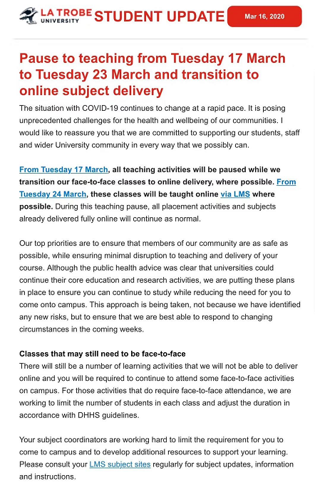 La Trobe大学宣布,从3月17日到3月23日,暂关闭学校!从3月24日开始线上上课!
