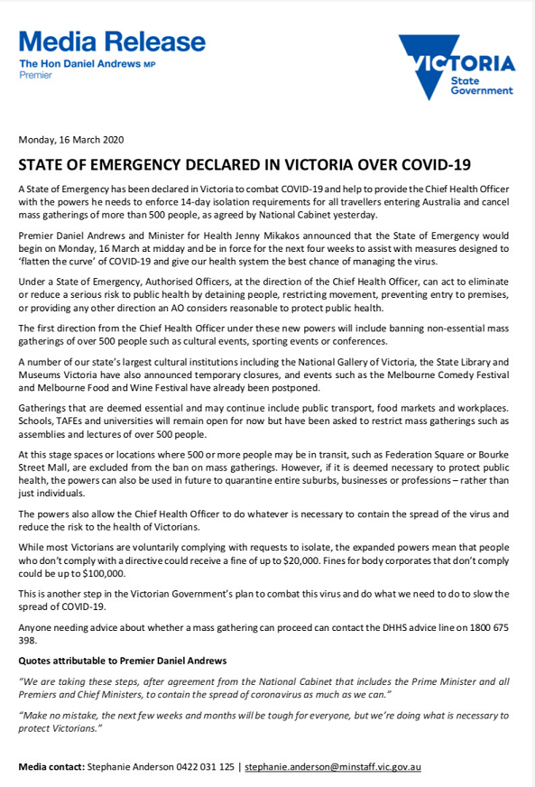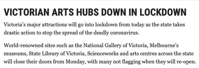 不光大学闭校,全澳部分地区也开始进入紧急状态!从今天起维州各大景点也将开始关闭,其中包括维州美术馆、图书馆、博物馆等。