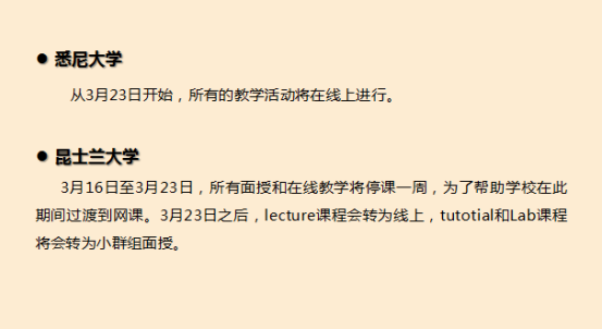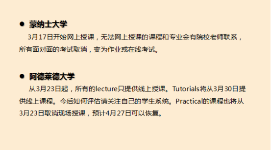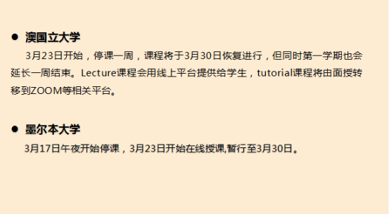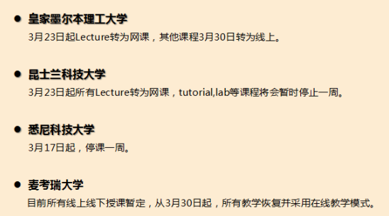 澳洲各大院校纷纷转为网络授课模式。建议已经在澳的留学生,待在澳洲家里学习上课,如要回国,途中会有感染的风险;在国内的学生,根据学校最新出台的政策,可以选择延期课程或者网络课程。同学们需要注意查看自己的邮箱,学校会随时给大家发邮件,通知新的流程和政策。