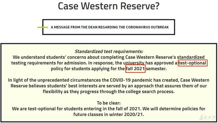 这个时候,凯斯西储大学公布了重磅消息:2021秋季申请者无需提供SAT/ACT成绩,采用“TestOptional”政策接受申请!!!