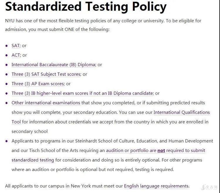 申请人可以用其他成绩代替标化成绩。比如有的学校在学生GPA达到一定标准后不再要求标化成绩,也有的学校接受AP成绩或者SAT Subject考试代替标化考试。比如纽约大学。