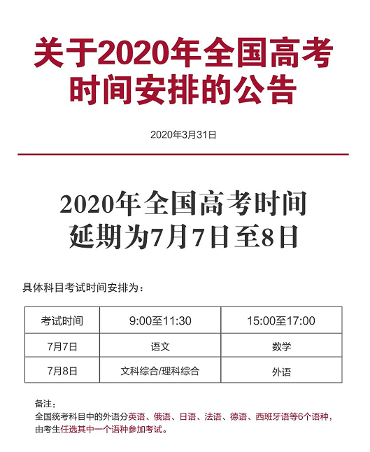教育部最新通知,2020年全国普通高等学校招生统一考试延期一个月举行,考试时间为7月7日至8日(湖北及北京除外)。