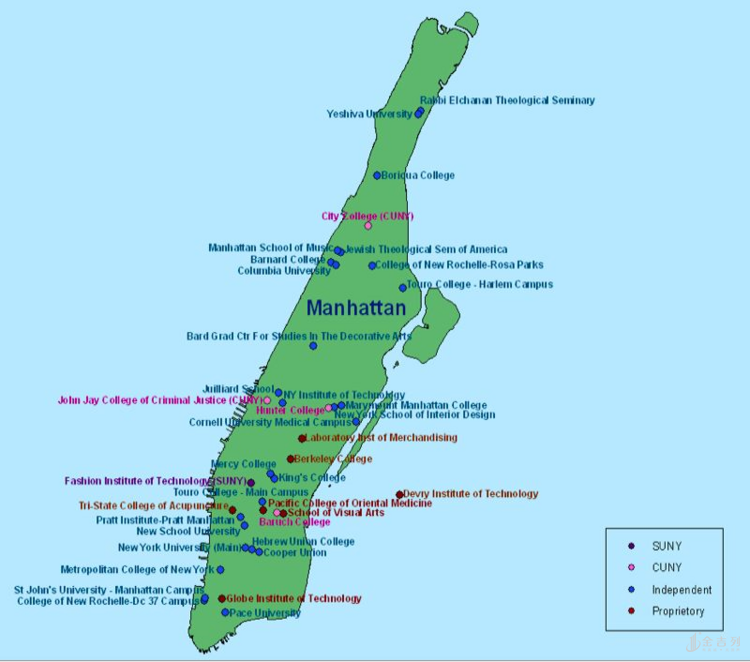 从这张分布图可以看出,纽约的五个行政区中,曼哈顿区虽然面积最小,大学数量却最多。下面是曼哈顿的大学分布: