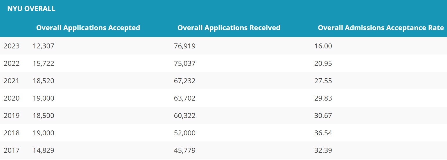 纽约大学也不乐于公布早申详细信息,且一再声称早申与常规申请的录取标准是一致的。从学校公布出来的综合录取率来看,过去5年持续走低,19季入学的综合录取率只有16%。纽约地理位置的巨大优势,对很多学生来说是不可低档的吸引力,预测本申请季的竞争热度不会降低。