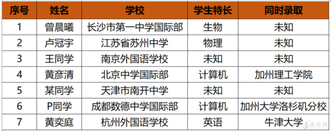 除了黄奕庭、王阿凤清、卢冠宇、P同学,还有来自南外和天津南开的两位同学,构成了哈佛RD强大录取团。再加上ED阶段唯一被录取的长沙女生曾晨希,这7位同学无一不是闪闪发光的佼佼者。