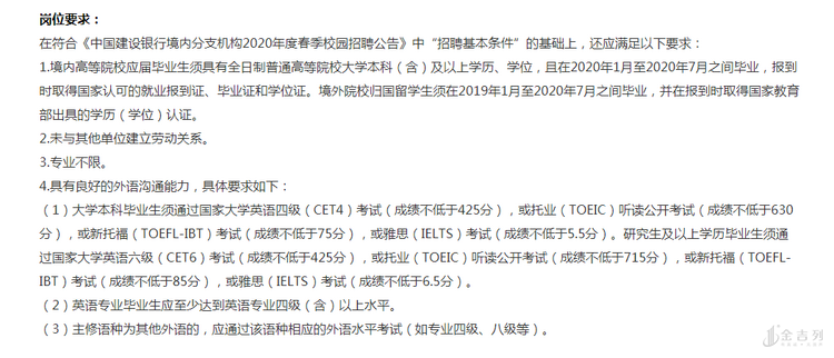 高盛等九大投行每年收到25万+的求职申请,通过率大约在2%;耳熟能详的四大会计师事务所的hr在求职季每天能刷上万份简历。看看中国建设银行柜台服务岗(在编)的要求: